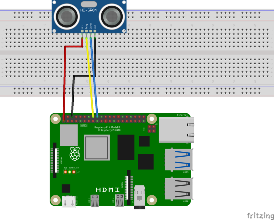 우선 라즈베리 파이를 준비하고, 다음과 같이 연결한다. TRIG 핀은 23번, ECHO 핀은 24번이다.